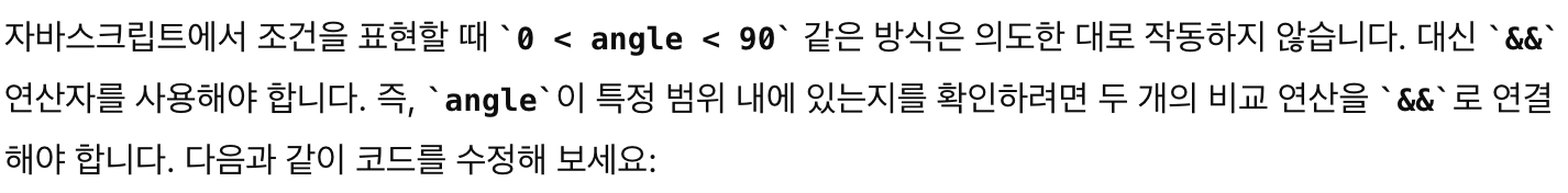 라고 한다. 따라서 0<angle<90 이 아니라, 0<angle&&angle<90으로 써야 맞는 코드인 거다.