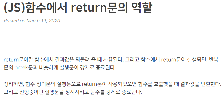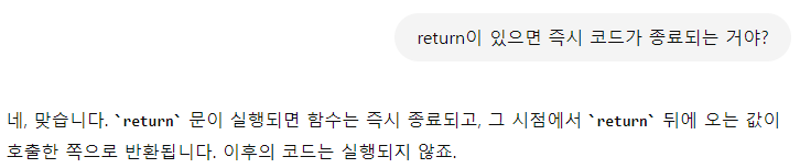 3. return이 있으면 그 즉시 함수가 종료된다고 한다. 이건 또 처음듣는 얘기라 확인했다.