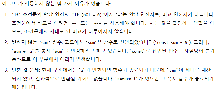 2. const는 상수인데, for문을 통해서 sum의 값을 변경하려고 하니 안됐던 것 같다. sum값이 변하는 건 재할당이구나. 생각지 못한 부분이어서 const를 재할당 가능한 var로 변경했다.