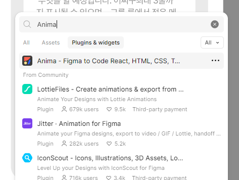 2. plugins&widgets 탭에서 Anima 검색, Run